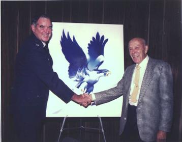 Lon had depicted birds of prey on each of his early Academy football program covers but it was the October 5, 1956 one for Colorado College, a falcon, that was adopted as their logo. Jay and Karen, Lon's son and daughter-in-law, returned from a trip to Colorado Springs in 1989 with a drinking glass etched with this logo that they had purchased at the Academy for Lon. Though retired, it inspired him to recreate the falcon -- first in a small study, then as seen here. The three traveled to the Academy for this presentation by Colonel John Clune, the officer in charge of athletics. (Click here for closer view of painting)